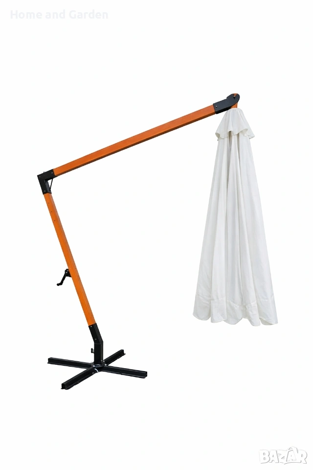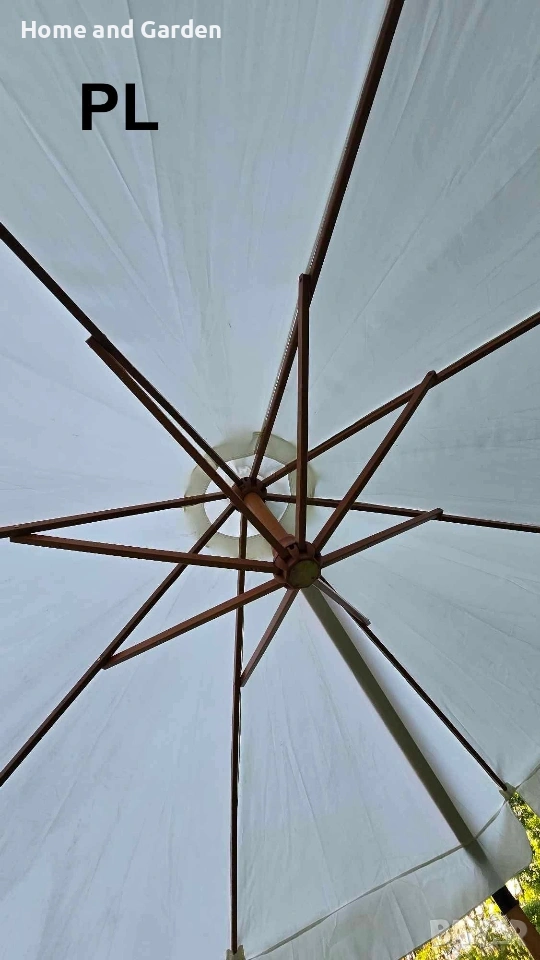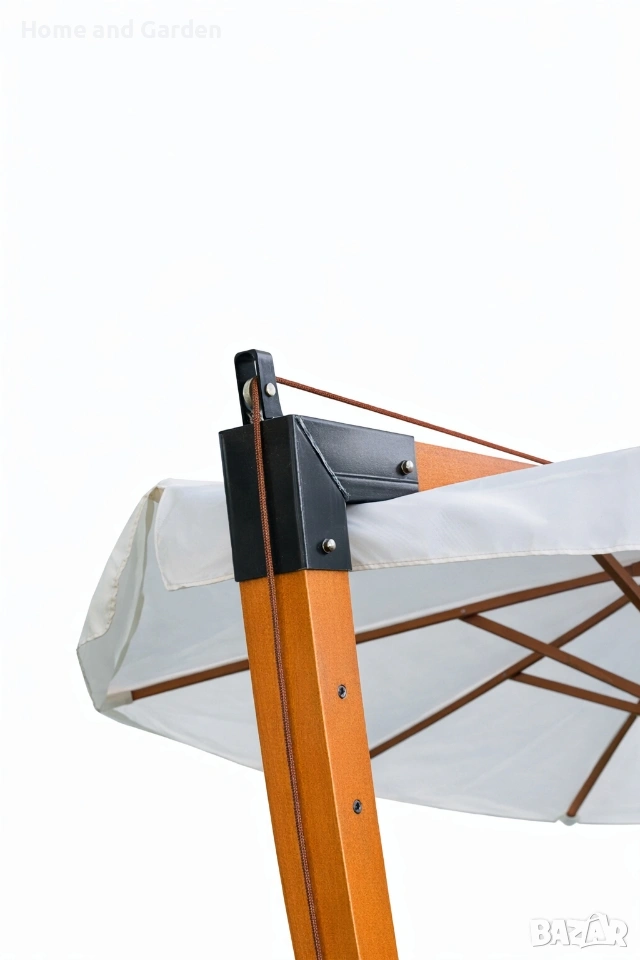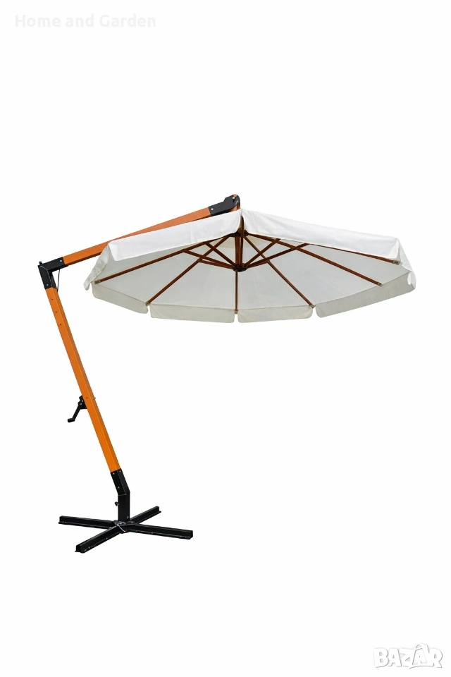 Градински чадър с метална стойка 3х3м. Диаметър 300 см, височина 290 см. Водоустойчив и UV-устойчив плат, дървен прът Ø 55 мм, 8 бамбукови спици, кръста желязна основа 100х100 см. С вентилационен отвор и манивела. Включени инструменти за монтаж.