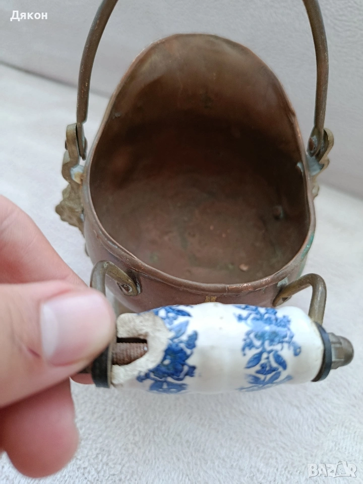 Автентична медна кофа с порцеланови дръжки,ръчно изкована изцяло медна с бронзови орнаменти ,,лъвски глави"с порцеланова дръжка.