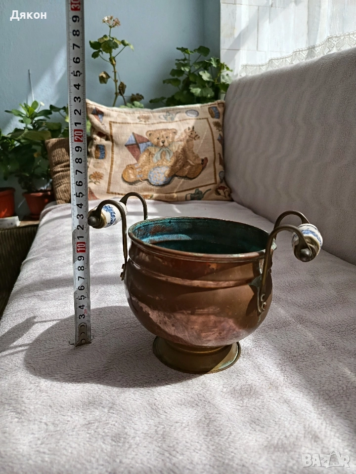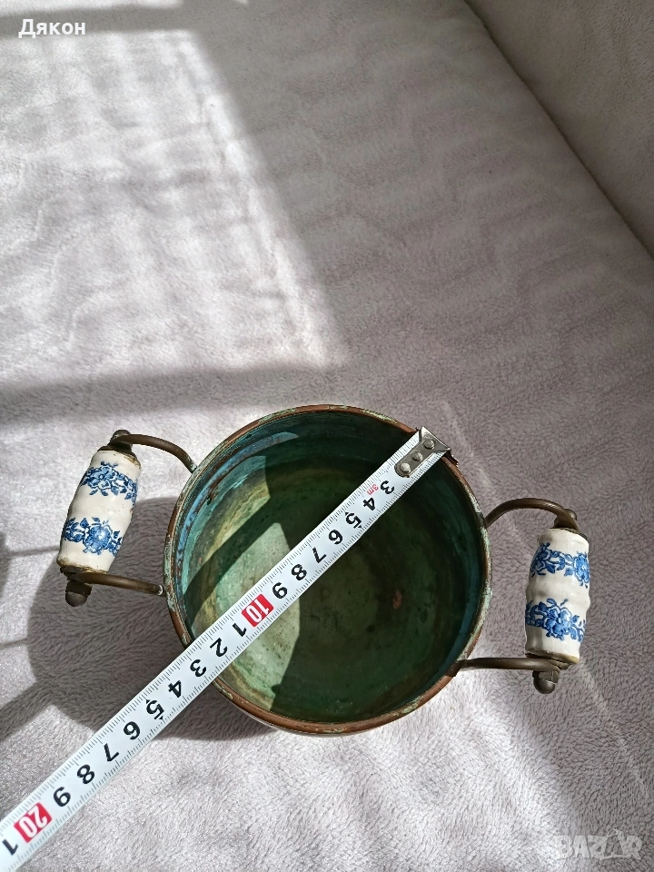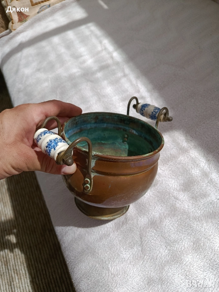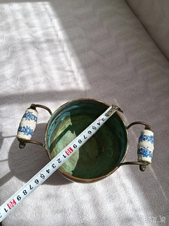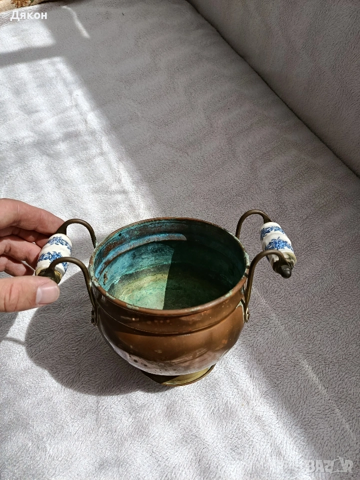медна кашпа Медна кашпа с порцеланови дръжки. → Обява 53922285