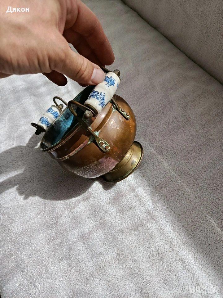 медна кашпа Медна кашпа с порцеланови дръжки.