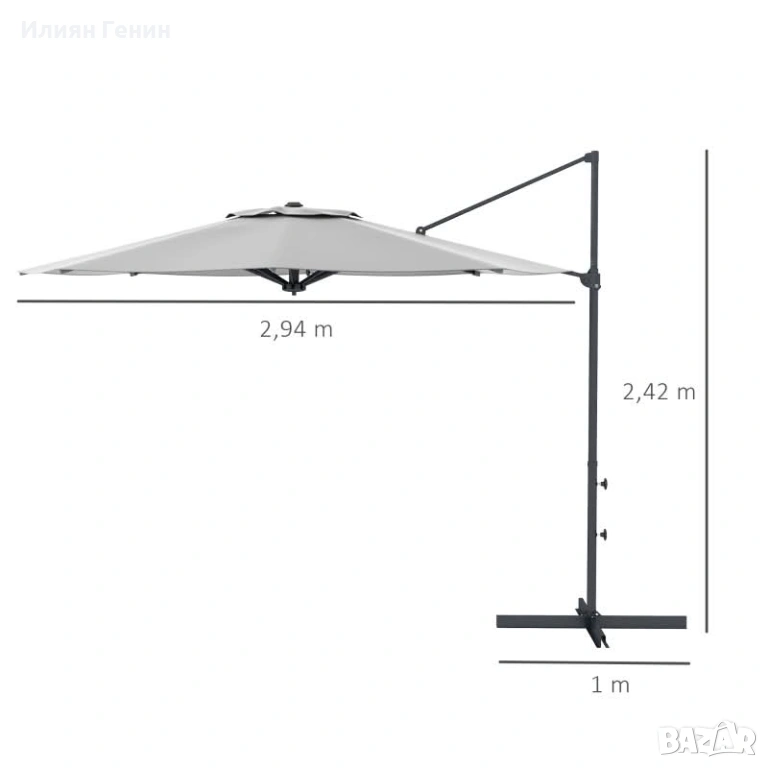 Размери на продукта: Ø2.94 x 2.42H м. Необходим е монтаж. ЗАБЕЛЕЖКА: Необходимо е минимално тегло от 80 кг (не е включено). Подходящи тежести за чадър Outsunny: 84D-070. Моля, свържете се с отдела за обслужване на клиенти за продуктови връзки, ако е необходимо. Не използвайте чадъра при екстремни метеорологични условия (силни ветрове, силен дъжд, сняг).
