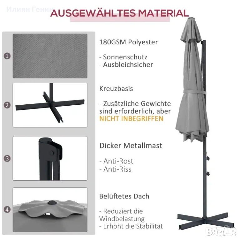 ✔ ЗАБЕЛЕЖКА 2: Не използвайте градинския чадър при екстремни метеорологични условия (силен вятър, силен дъжд, сняг)