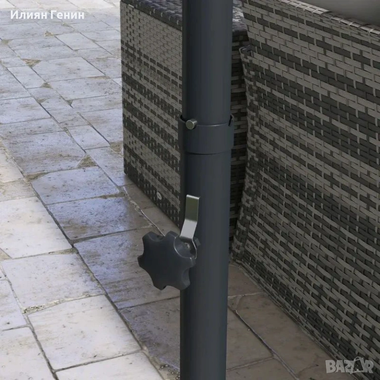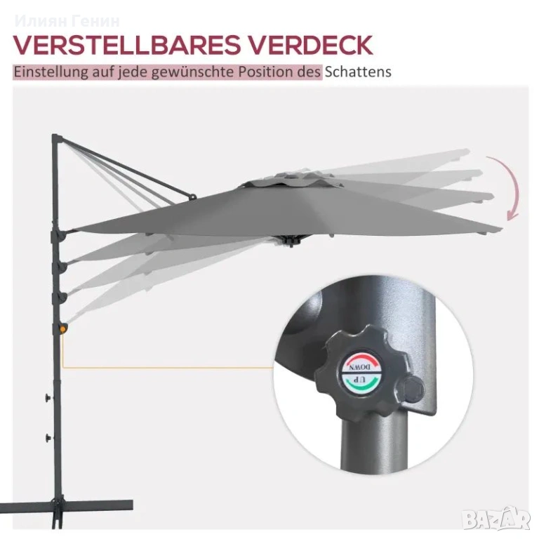 Накланящ се чадър: Можете да го регулирате във всяка желана позиция. А манивелата е проектирана така, че чадърът да се отваря и затваря лесно.