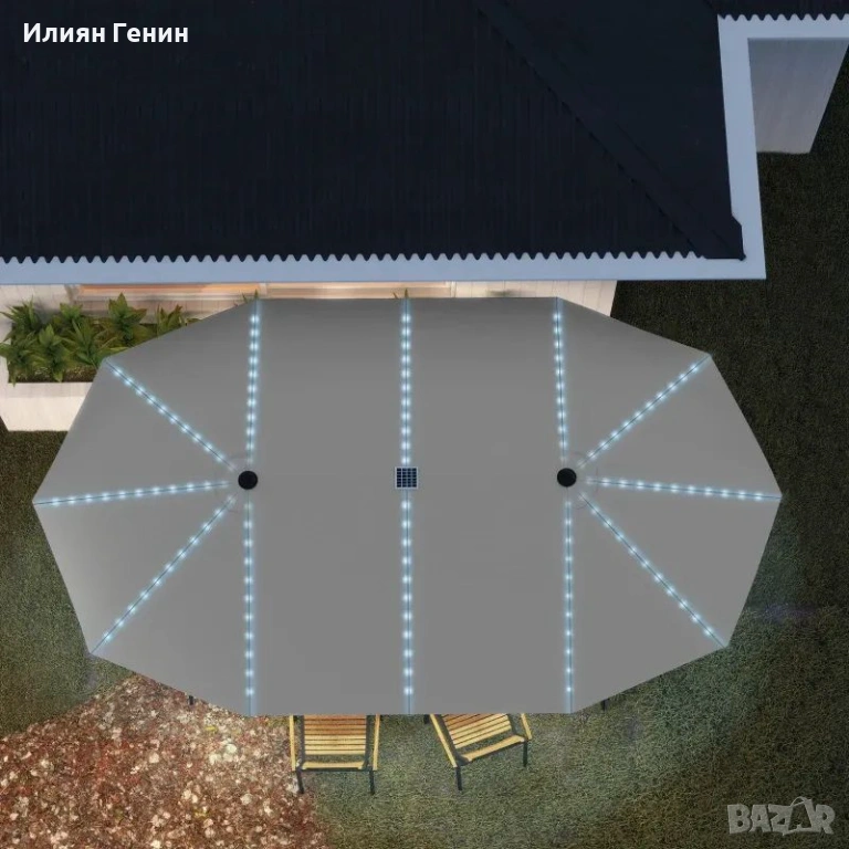 Очарователна нощна атмосфера: Този голям чадър е с LED светлини по ребрата си, създаващи приятно осветление вечер. Може да се зарежда чрез слънчева енергия или USB.