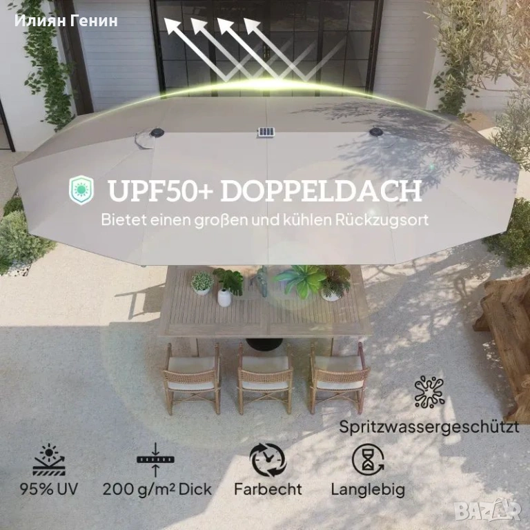 Превъзходна UV защита: Изработен от висококачествен полиестер 200 г/м², този двоен чадър предлага слънцезащита UPF50+ и ефективно предпазва от UV лъчи.