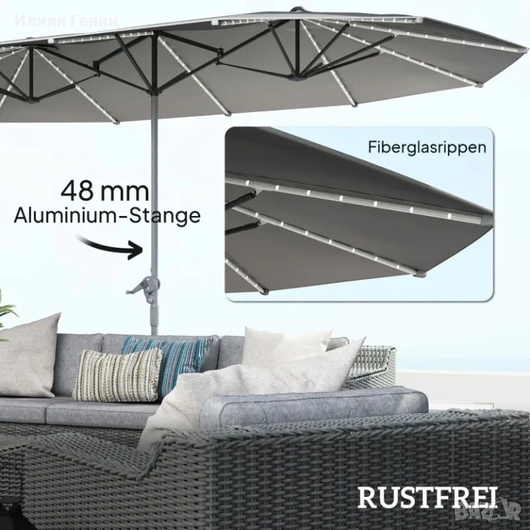 ✔ Алуминиевата мачта и подпорите от фибростъкло на двойния чадър осигуряват опора без ръжда.