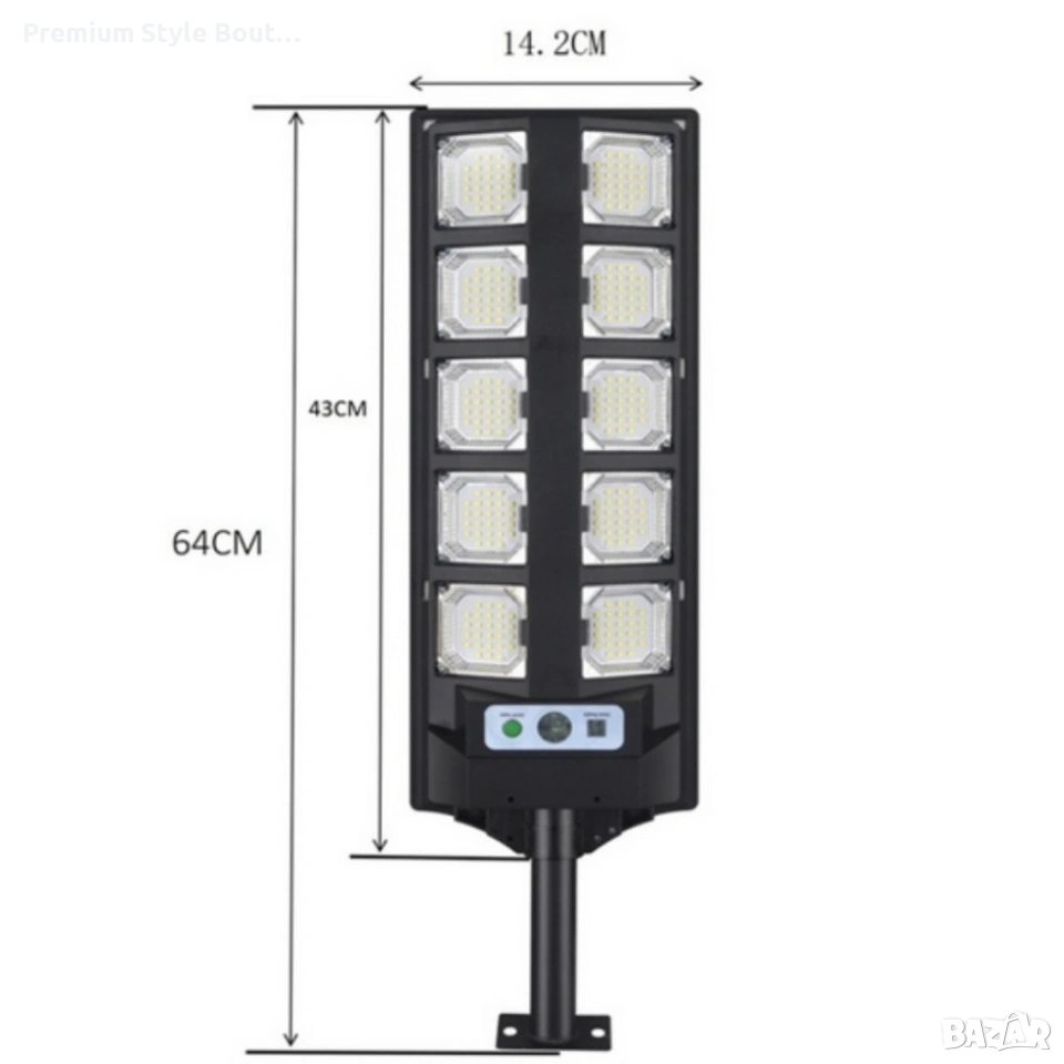 Технически характеристики на Улична соларна лампа BK-260-10 DRAGON 3000W - мощна и икономична Технически данни (резюме): Мощност: 3000W LED секции: 10 Режими: 3 (висок, икономичен, сензор за движение) Сензор: Вграден PIR за движение Дистанционно управление: включено Клас на защита: IP65 (водоустойчив и прахоустойчив) Дължина (със стойка): 64 см; Височина на панела: 43 см; Ширина: 14.2 см Захранване: Соларна енергия (интегрирани панели/батерия) Приложение: Външно осветление за двор, градина, паркинг, пътеки и фасади