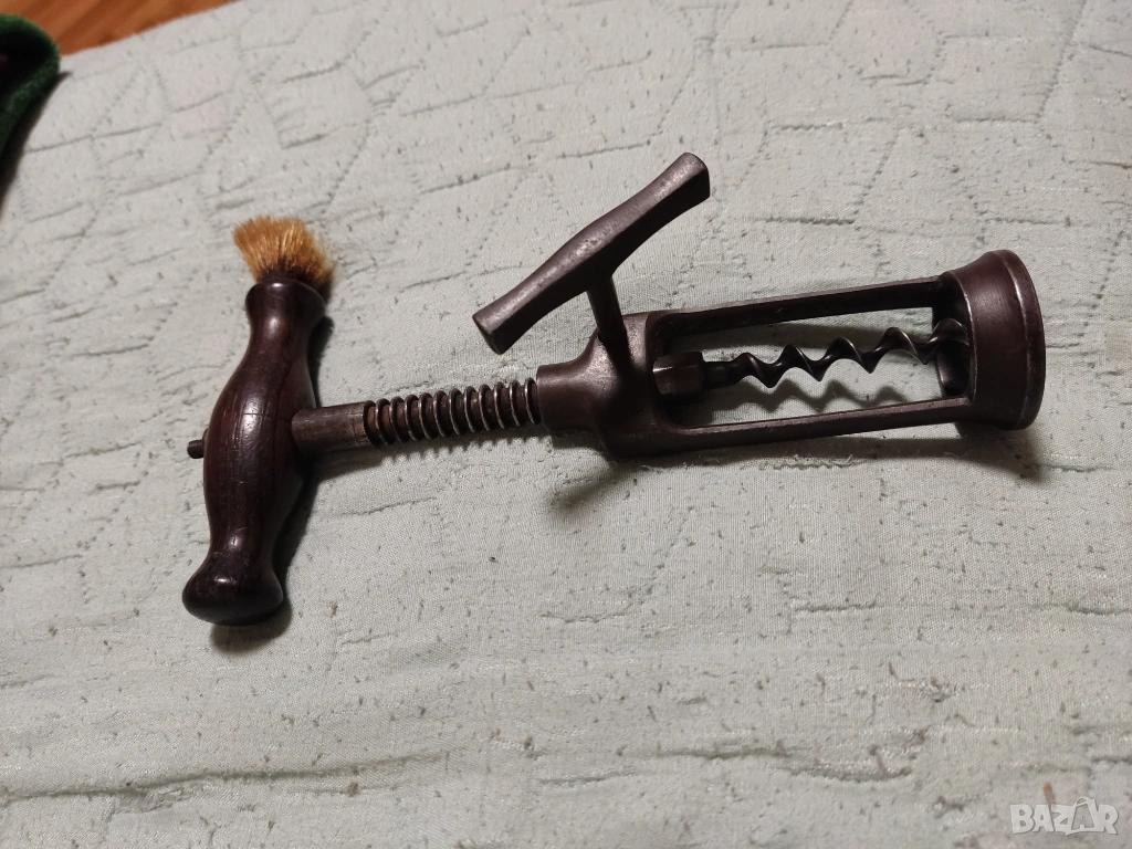 3. Античен тирбушон със зъбчата рейка и пиньон (тип "London Rack") позволяваща плавно изваждане на тапата чрез завъртане на страничната ръкохватка след забиване на винта. датиращ от края на XIX или началото на XX век. Предмети са високо ценени от колекционерите заради техния механичен дизайн и историческа стойност. Изработен е от бронз или стомана с дървена дръжка от твърда дървесина. Четката в горната част на дръжката е направена от естествен косъм (често от дива свиня) и е служела за почистване на праха или восъка от гърлото на бутилката преди отваряне.