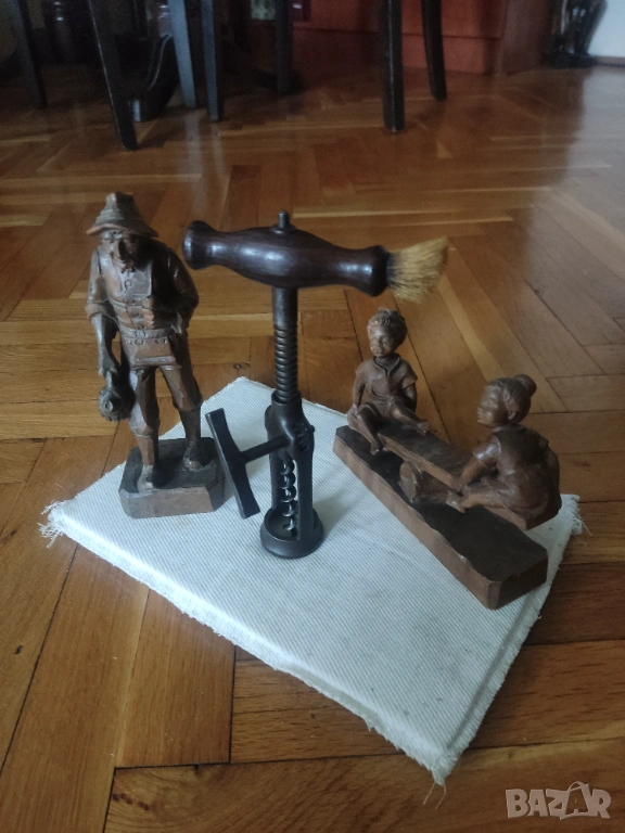 Дървени фигурки, статуетка деца на люлка, мъж, стар тирбушон XIXв