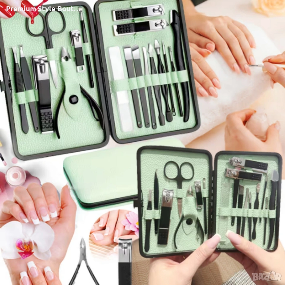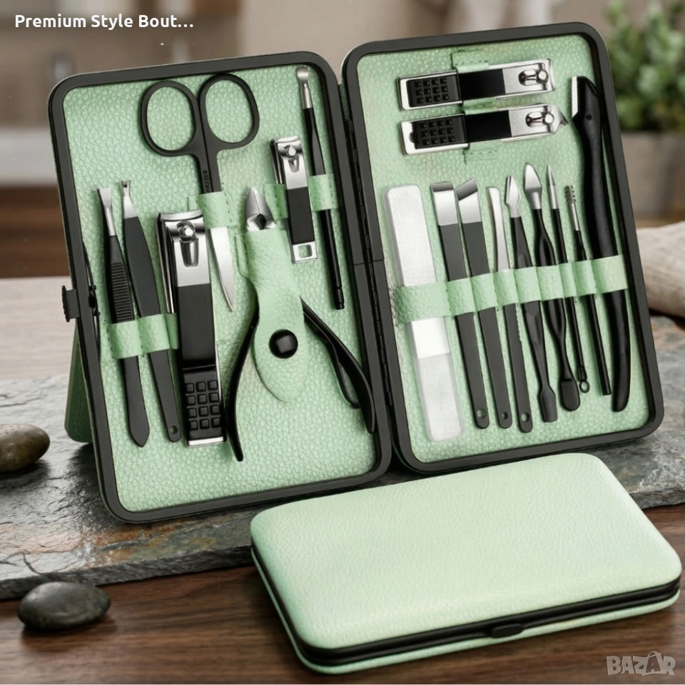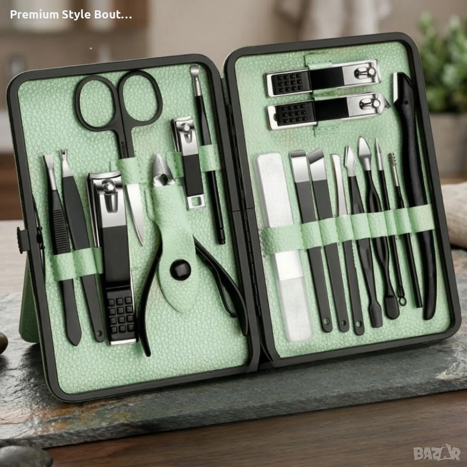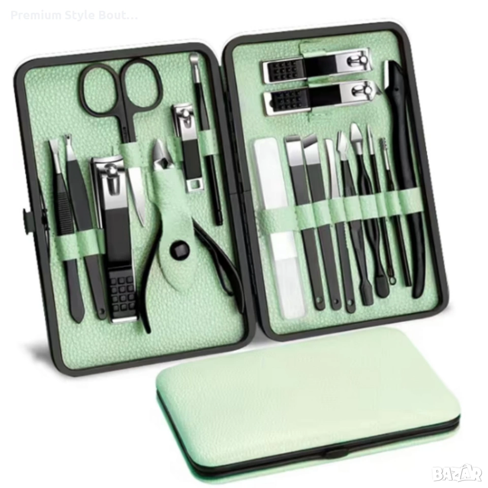 Комплект за маникюр от 18 части в елегантен зелен калъф