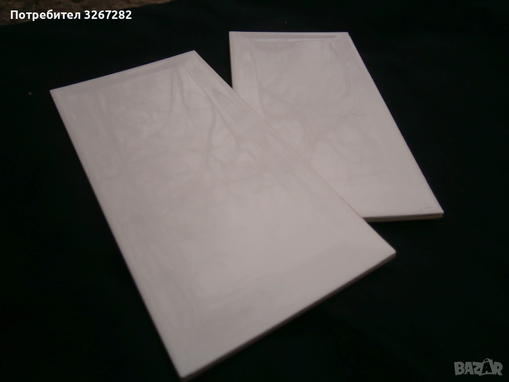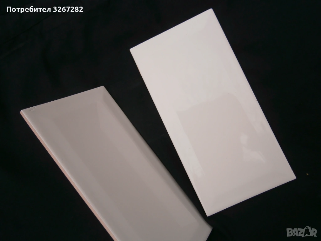 Отлично запазени, бели, с леко изпъкнал релеф, фаянсови, правоъгълни плочки, с размер 10 см. на 20 см. В наличност са 600 броя в кутий.