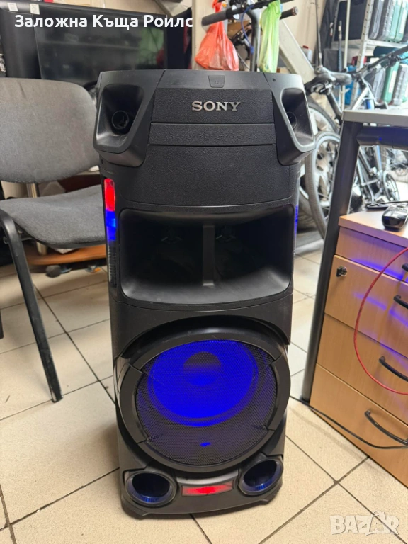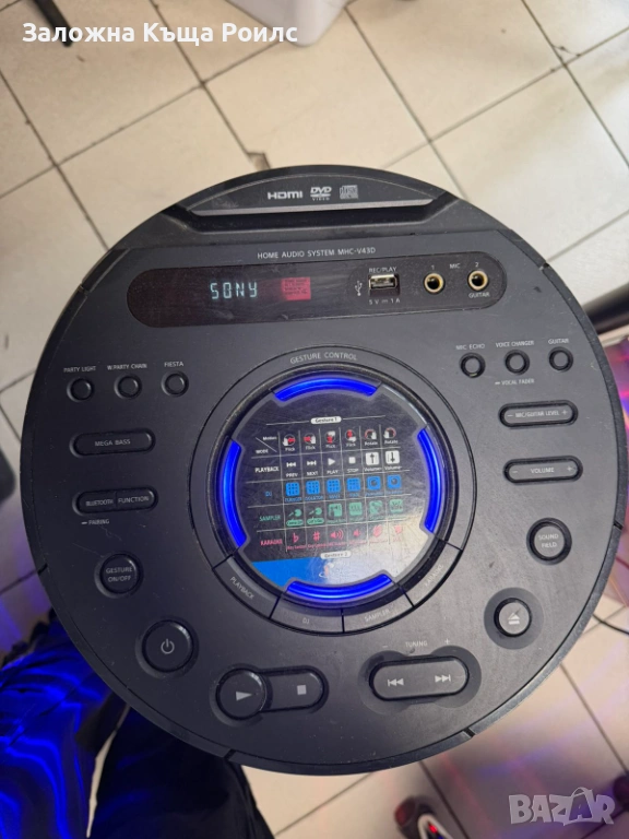 Bluetooth тонколона Sony MHC-V43D в добро състояние. Уредът работи отлично, със силен и чист звук, подходящ за партита и домашно ползване. Разполага с Bluetooth, USB, CD и DVD плейър, както и светлинни ефекти.