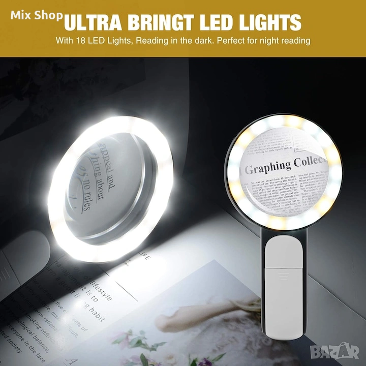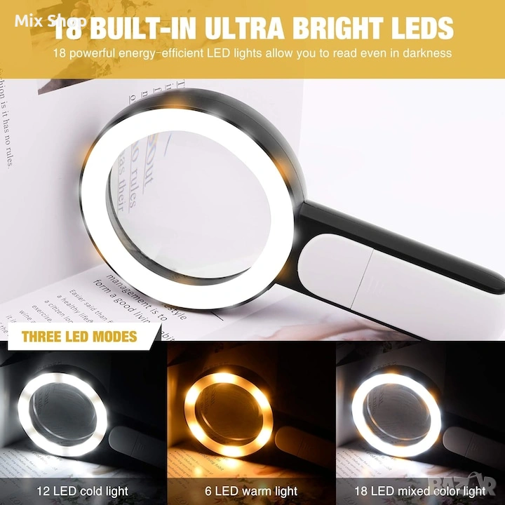 УВЕЛИЧЕНИЕ С ВИСОКА МОЩНОСТ: Тази лупа предлага 30-кратно увеличение, което позволява на потребителите с увредено зрение да четат текст независимо от размера. УЛТРА ЯРКИ 18 светодиода С 3 РЕЖИМА: Вградените 18 енергоспестяващи LED светлини осигуряват допълнителна яркост, за да осигурят по-добро цялостно изживяване при четене дори през нощта или на тъмни места. 3-те безстепенно регулируеми режима на осветяване (студено, топло и смесено) могат да се превключват според различни светлинни условия, което може да намали зрителната умора, което е много полезно за хора с макулна дегенерация или хиперметропия/файопия. ЛЕСЕН ЗА