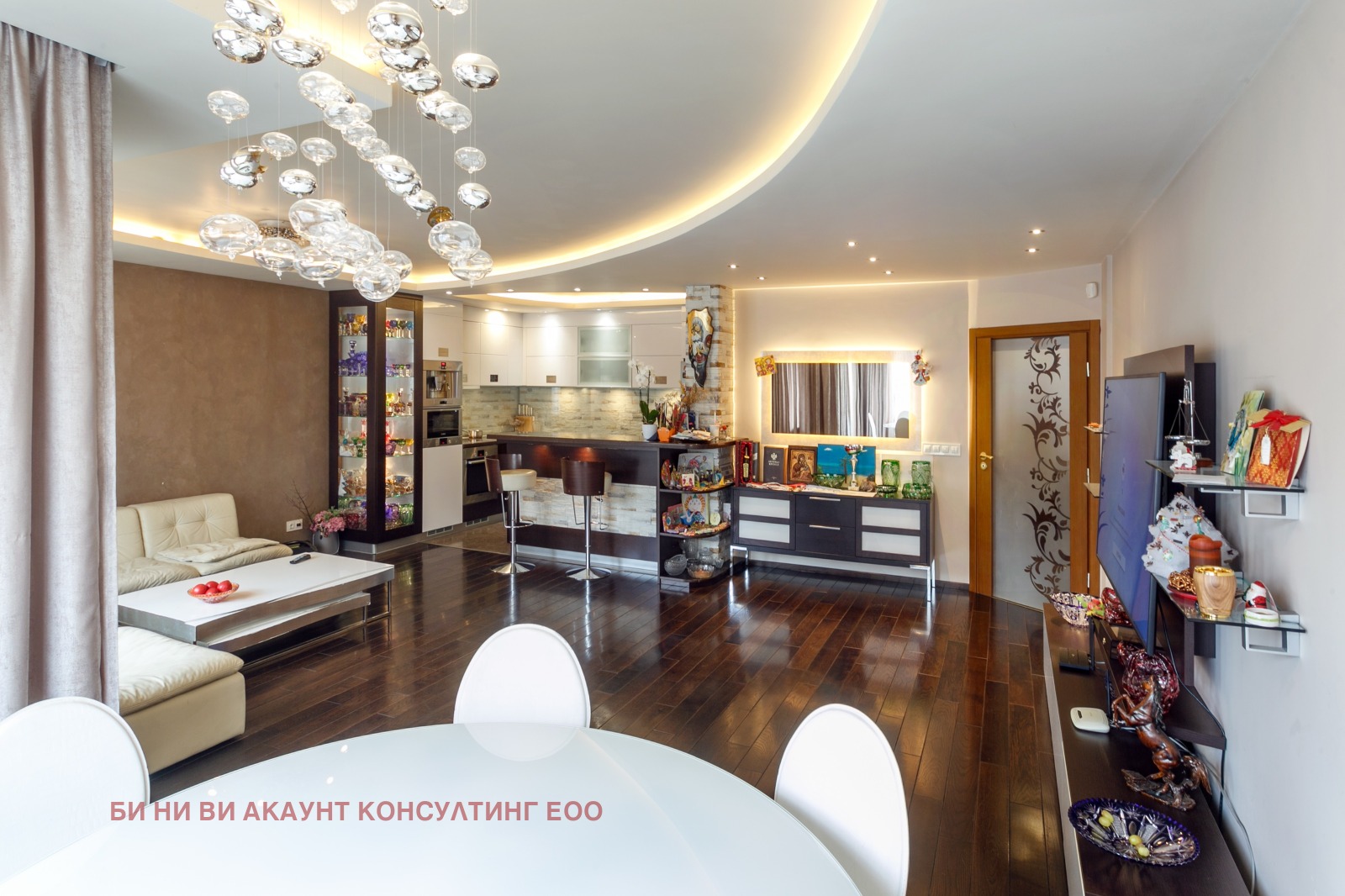 ОБЗАВЕЖДАНЕ И ИЗПЪЛНЕНИЕ: Апартаментът впечатлява със стилен интериор и италиански дизайнерски мебели във всички помещения. Кухнята е изпълнена по индивидуален проект и оборудвана с висок клас електроуреди BOSCH: