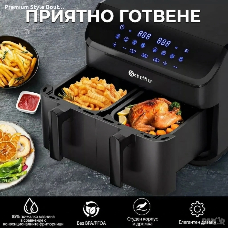 Фритюрник с горещ въздух XXL 9L, 2 камери, 8 програми, Двойно готвене & Синхронизиран финал