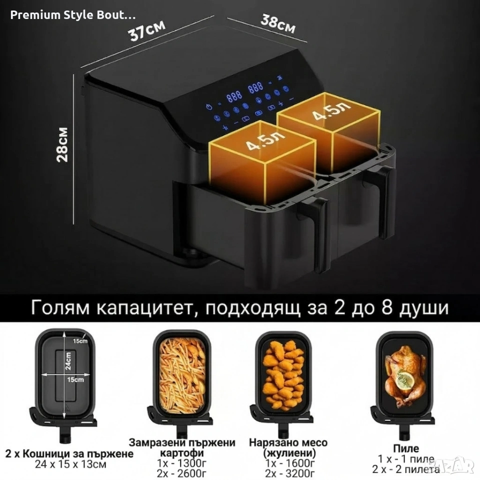 Капацитет: 9 л (2 x 4,5 л) Мощност: до 2000 W Температурен диапазон: 80°C – 200°C Таймер: до 60 минути Режими: 8 предварително зададени програми Управление: сензорен панел, LED дисплей Функции: Sync Finish, поддържане на топло, автоматично изключване, защита от прегряване Материали: незалепващо покритие, BPA free компоненти, подвижни филтри за лесно почистване