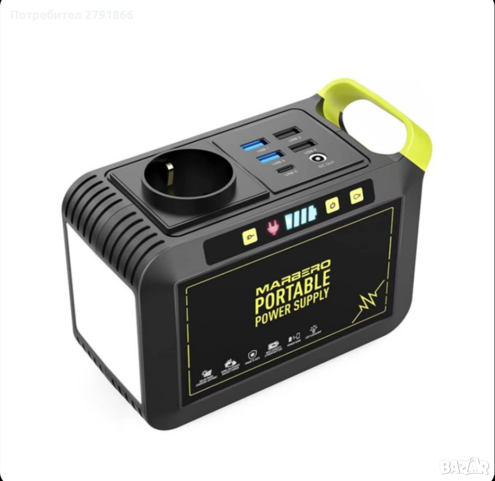 - ПАКЕТЪТ ВКЛЮЧВА: 1* Преносима електроцентрала MARBERO M82, 1* Захранващ адаптер, 1* Изход за запалка, 1* Ръководство за потребителя