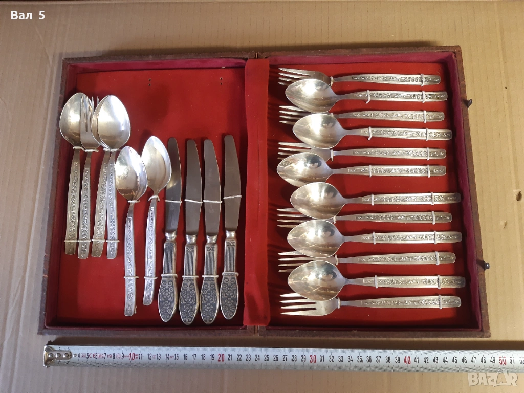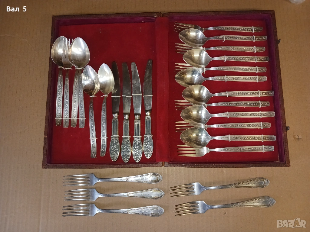 4 ножа , 7 + 5 вилици и 11 лъжици в оригинална кутия . Дебело посребрен мелхиор , тежки , масивни , качествени , не са почистени . Петте вилици извън кутията също са съветски , качествени , но не са от комплекта и не са посребрени . 2а 4