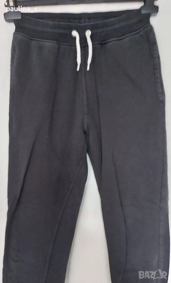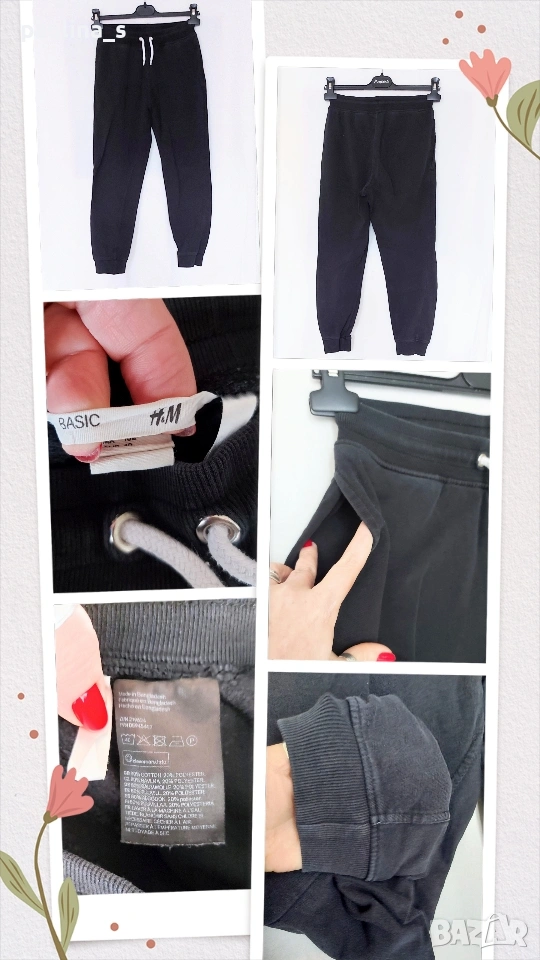 4️⃣ Колаж / XS / M - "H&M" basic. Цената е крайна, без пазарлъци 9 евро. Черно еластично долнище за спорт и туризъм или за у дома, има лек избелващ ефект по краищата. Материята е с 80 % памук и ликра, странични джобове, маншети на крачолите, широк ластик с шнур на талията, не е чисто ново, но е без дефекти и етикет, една бройка е, става за посочените размери, вижте мерките в обявата, моля.