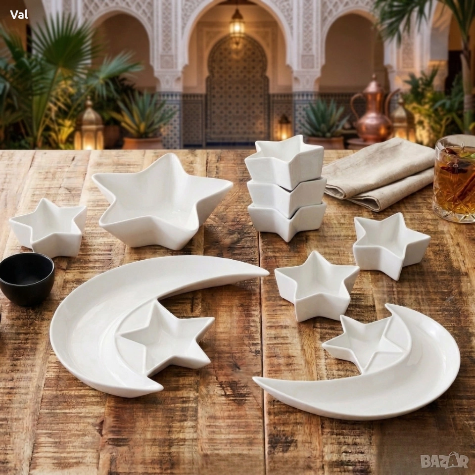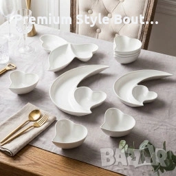Материал: висококачествен порцелан Брой части: 9 (1 голяма чиния, 1 средна чиния, 6 малки купички, 1 тройна купичка) Дизайн: форма „Пеперуда“ за естетично поднасяне Подходящо за: сервиране на студени и топли храни (съобразено с указанията за порцелан) Поддръжка: препоръчва се ръчно или внимателно миене в съдомиялна при щадящ режим