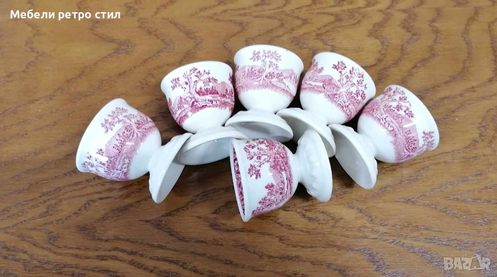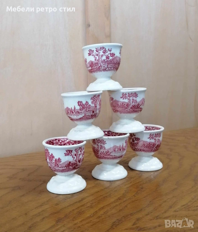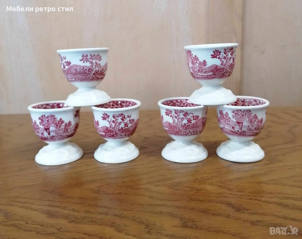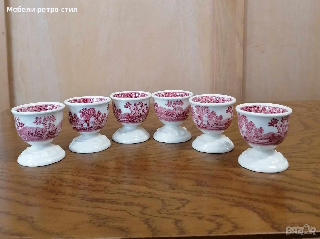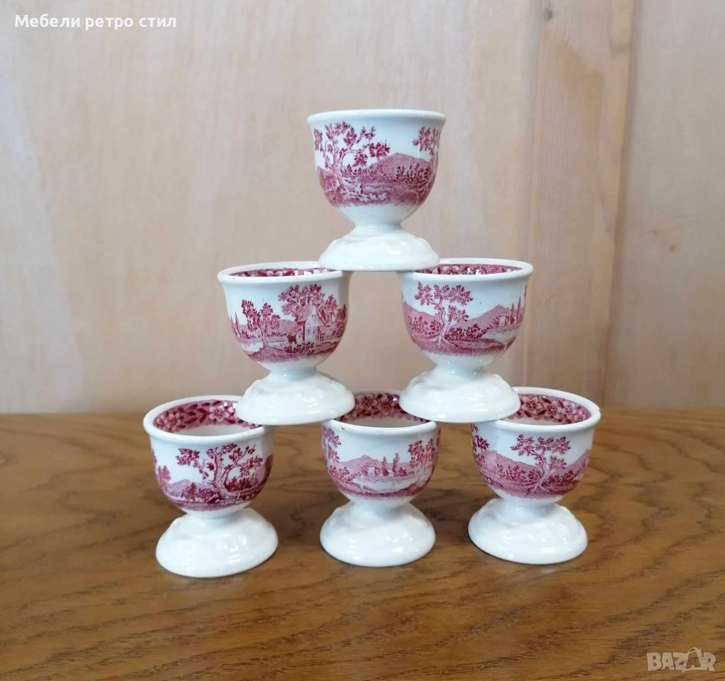 Комплект от шест броя стилни порцеланови чашки за яйца произведени от " Villeroy & Boch" от серията '' Rusticana" С фин червен пейзажен мотив. Дизайна носи усещане за аристократична трапеза и неподвластна на времето елеганност. Размери височина - 5 см, диаметър 5 см. Цена за к-кт 36 € / 70,41 лв.