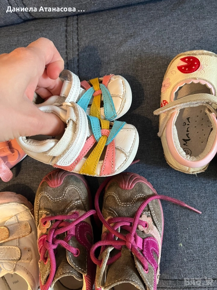 Детски обувки боси от естествена кожа за момиченце, номера 18,19,20,21. Носени са, но повече изцапани, защото детето е лазило навън с тях, иначе подметките са в отлично състояние. Цената е 10€ за всички заедно