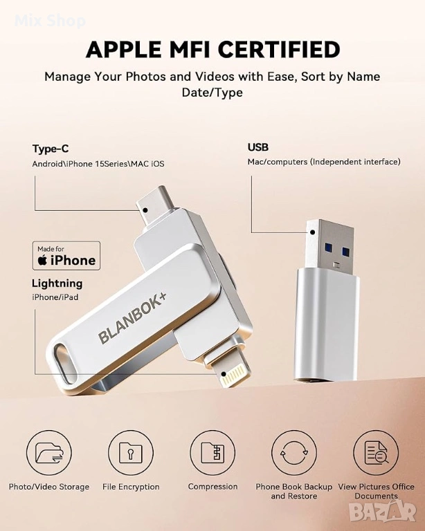 Удобен и лесен за употреба: Този MFi 512 GB USB стик за iPhone ви позволява лесно да архивирате снимки, видеоклипове и телефонен указател от телефона си само с едно щракване, използвайки приложението на флашката. Можете също така да архивирате файлове на компютъра си, използвайки USB порта, осигурявайки двойна защита. (Забележка: iPhone/iPad трябва да изтегли приложението "Luxsync Pro" (обновена версия, старата версия беше „BLANBOK+“ приложение) от APP Store, когато използвате Jump Drive; телефонът с Android трябва да включва OTG функцията, не е необходимо да изтегляте приложението)