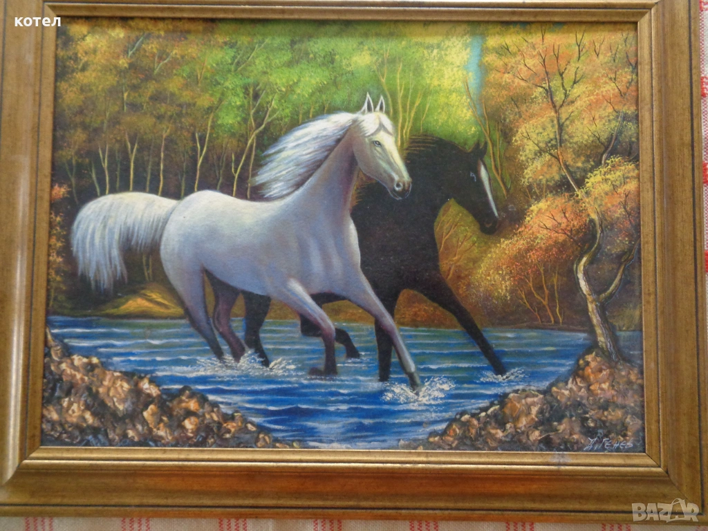 Продавам авторска картина с маслени бои на известния български художник Димитър Генев. Творбата изобразява емблематичен за автора сюжет – бял и черен кон, препускащи през вода сред есенен пейзаж.