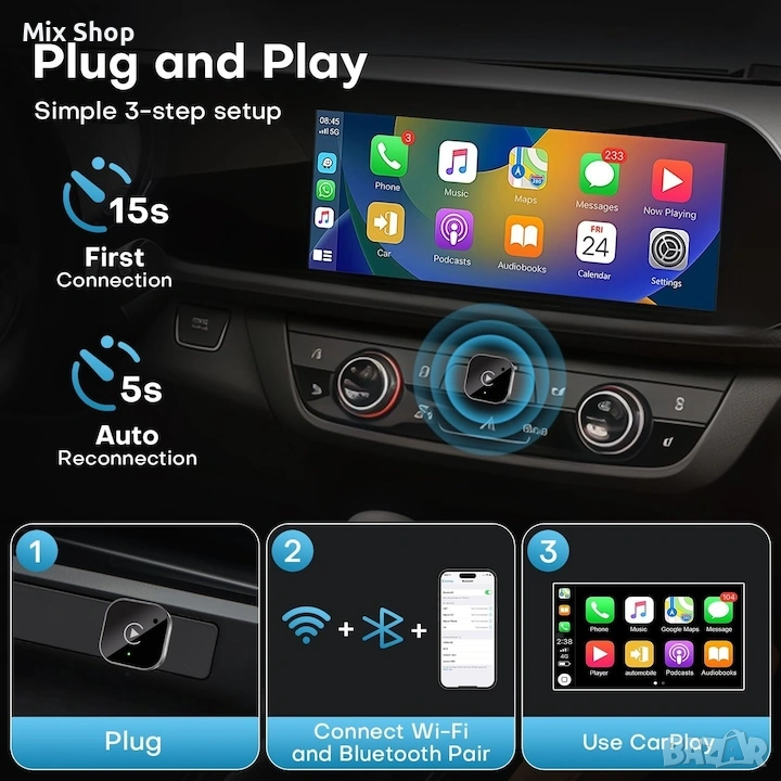 Безжичен CarPlay и Android Auto адаптер, plug-and-play