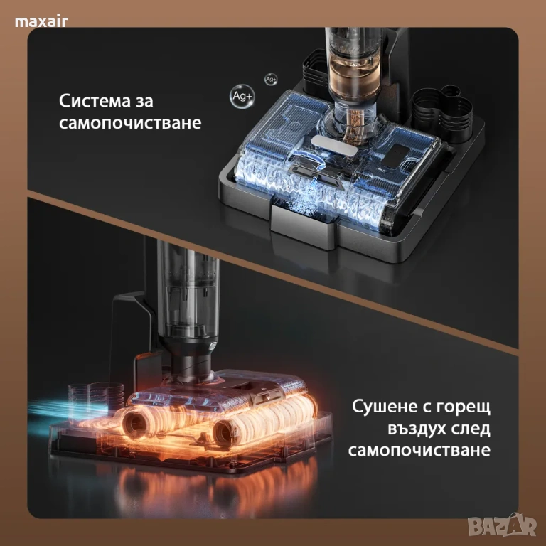 Въртящите се ролкови четки, въздушният път и резервоарът за мръсна вода се изсушават напълно с горещ въздух след самопочистване, за да се предотвратят появата на мухъл и неприятни миризми.