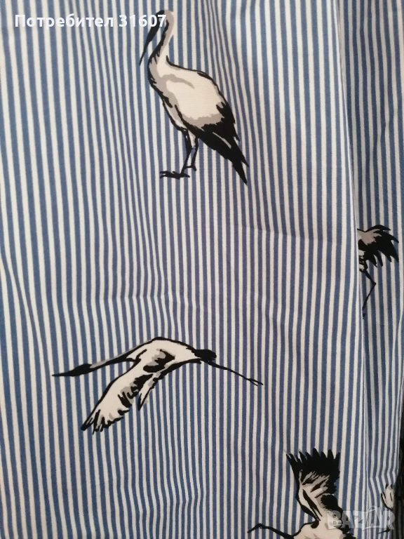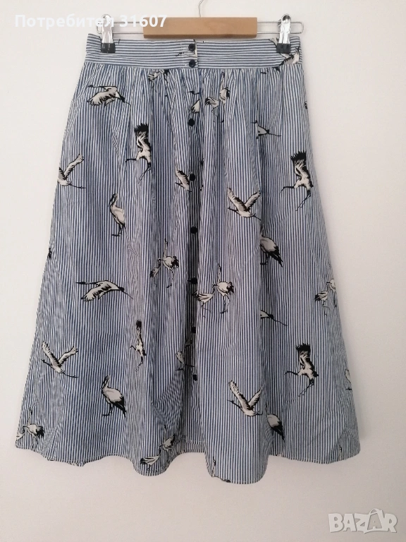Полата е с класическо бяло-синьо вертикално райе и страхотен контрастен принт на черни жерави. Силно набрана в талията (тип А-силует), дължина под коляното - 68 см. Закопчава се с копчета по цялата дължина. С две странични джобчета. Лека памучна материя, идеална за пролетта и лятото. Полата стои много стилно с изчистен бял топ или тениска и кецове/сандали. Перфектна за разходка или по-специален повод.