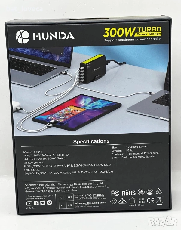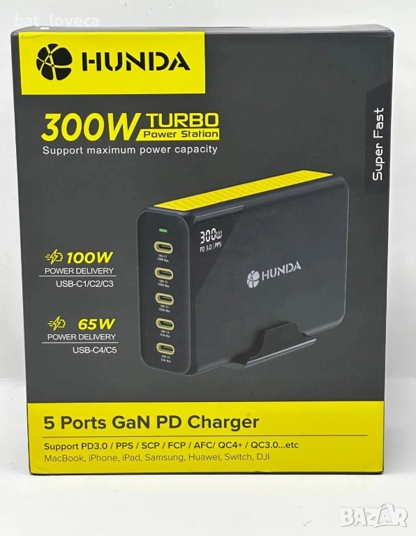 Зарядно устройство HUNDA USB C, общо 300W GaN бързо зарядно с 5 USB C порта