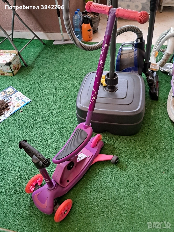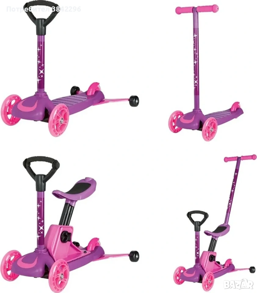 Триколка 4 в 1, закупена от Кауфланд. За най-малките - бутане от родител, за порасналите се превръща в тротинетка с 2 предби гуми и възможност - с или без помощни задни колела.