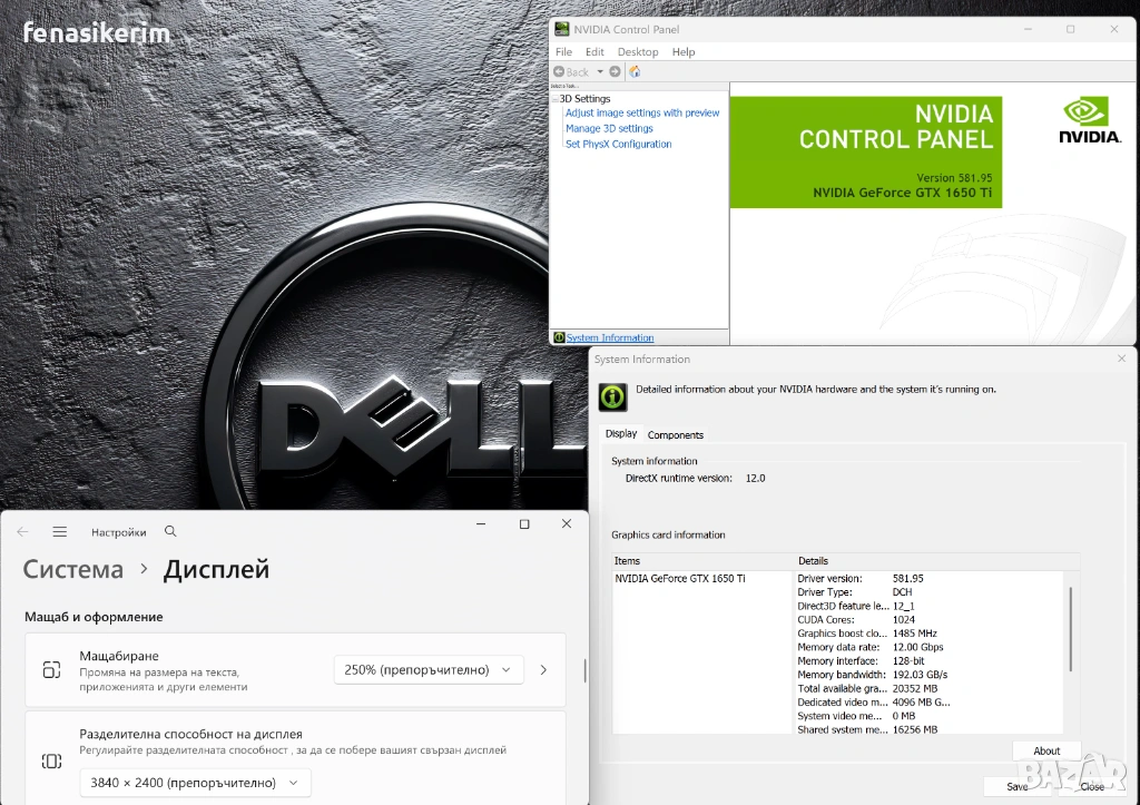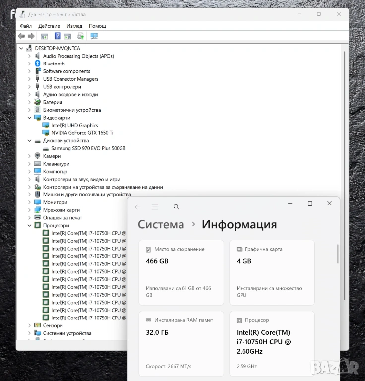 2 видеокарти : Nvidia GTX 1650 Ti 128bit 4GB DDR6 собствена памет + Intel UHD Video - up to 20 GB Shared Graphics memory