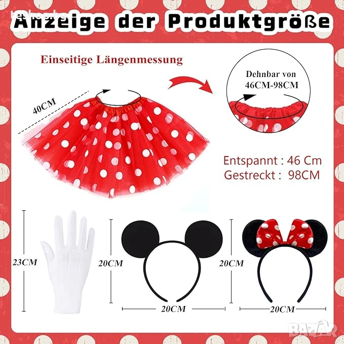 Универсален размер- Полата тип туту с надпис „Мини Маус“ има еластична талия, специално проектирана да пасва на повечето жени и момичета, което позволява на момичета от всякакъв размер да я носят лесно и удобно. Дължината на полата „Мини“ е 30 см, а обиколката на талията варира от 46 до 98 см.