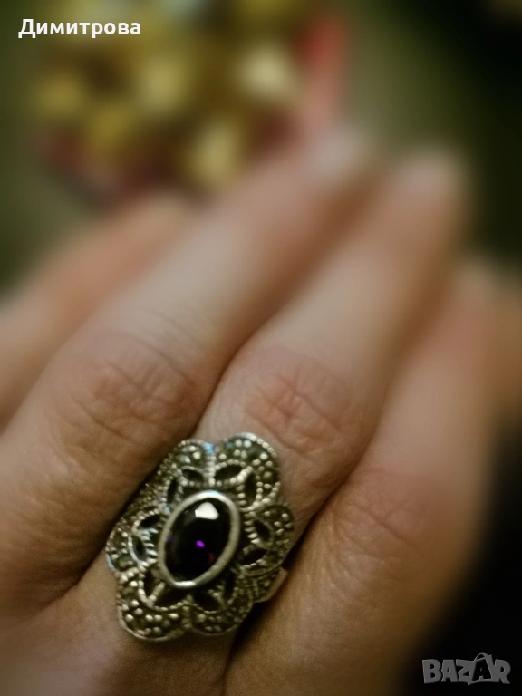 Разкошен пръстен с аметист и марказити - гарантирано сребърен, с две маркировки и висулка на М К от стомана и кристали Сваровски.