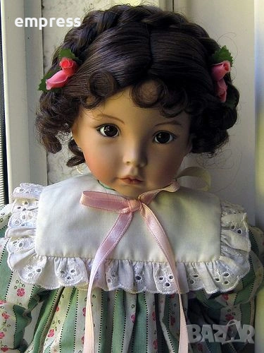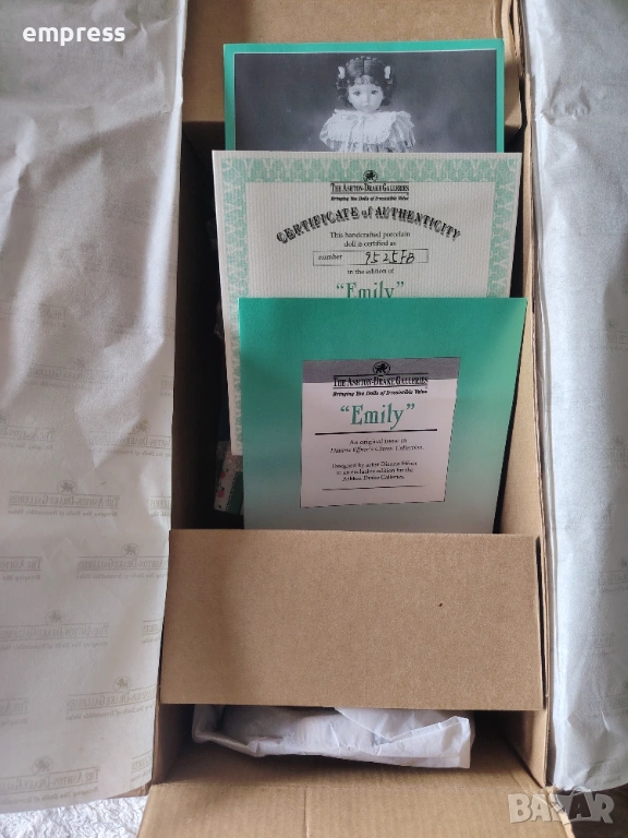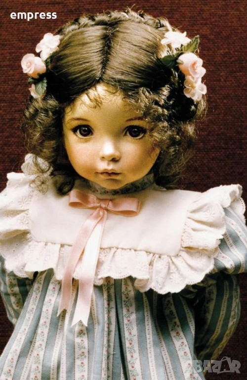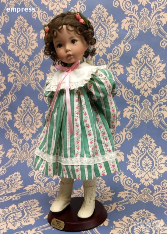 Те рядка и изключително търсена от колекционерите по света. Emily впечатлява със своето нежно, почти живо изражение – големи топли очи, деликатно изваяно лице и красива къдрава коса, украсена с малки розови цветя. Облечена е в изящна рокля в зелено и бяло с фин флорален десен, допълнена от дантелена яка и нежна розова панделка, които ѝ придават класическа елегантност и чар.