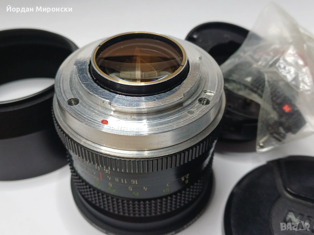 Обектива е преработен от Слав от В.Търново за Nikon но оригиналнате му части са на лице и може да се възстанови в оригиналния си вид.