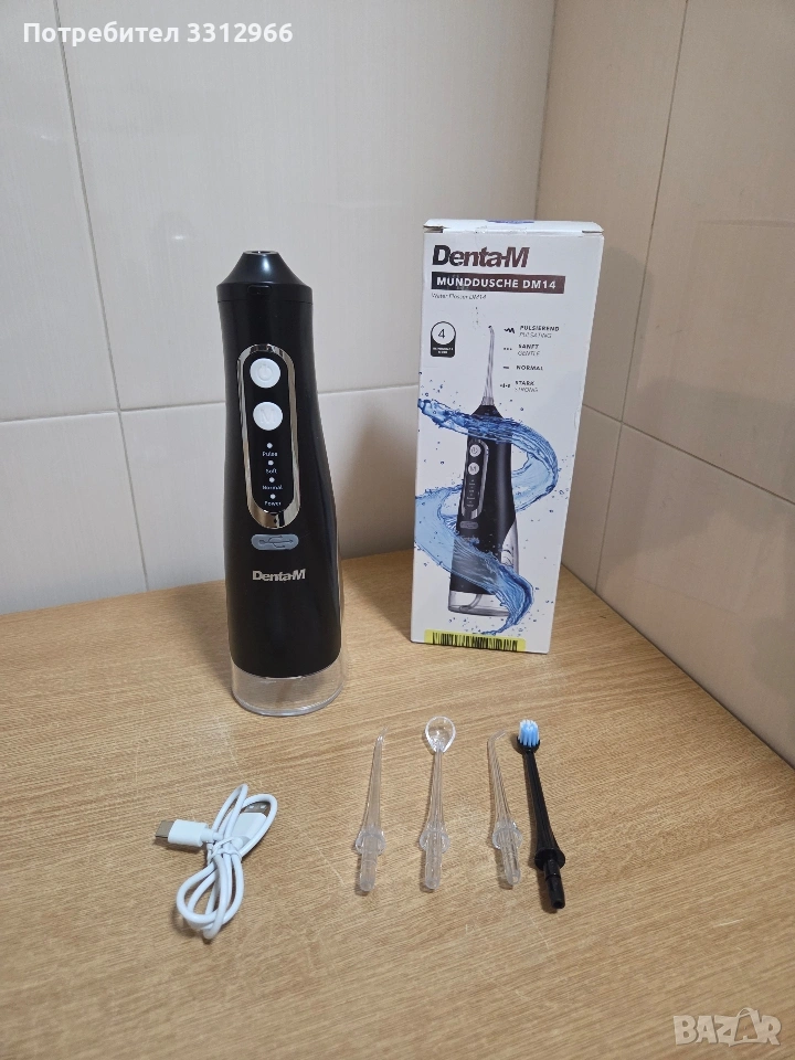 Чисто нов зъбен душ Denta-M Munddusche DM14. Режими на работа: Разполага с 4 режима: импулсен, нежен, нормален и силен. Характеристики: Водоустойчив (IPX7), с обем на резервоара 310 мл и акумулаторна батерия, която се зарежда за 1 час. Комплект: Включва иригатор, 4 накрайника (стандартни, за четка, за език) и USB кабел за зареждане.