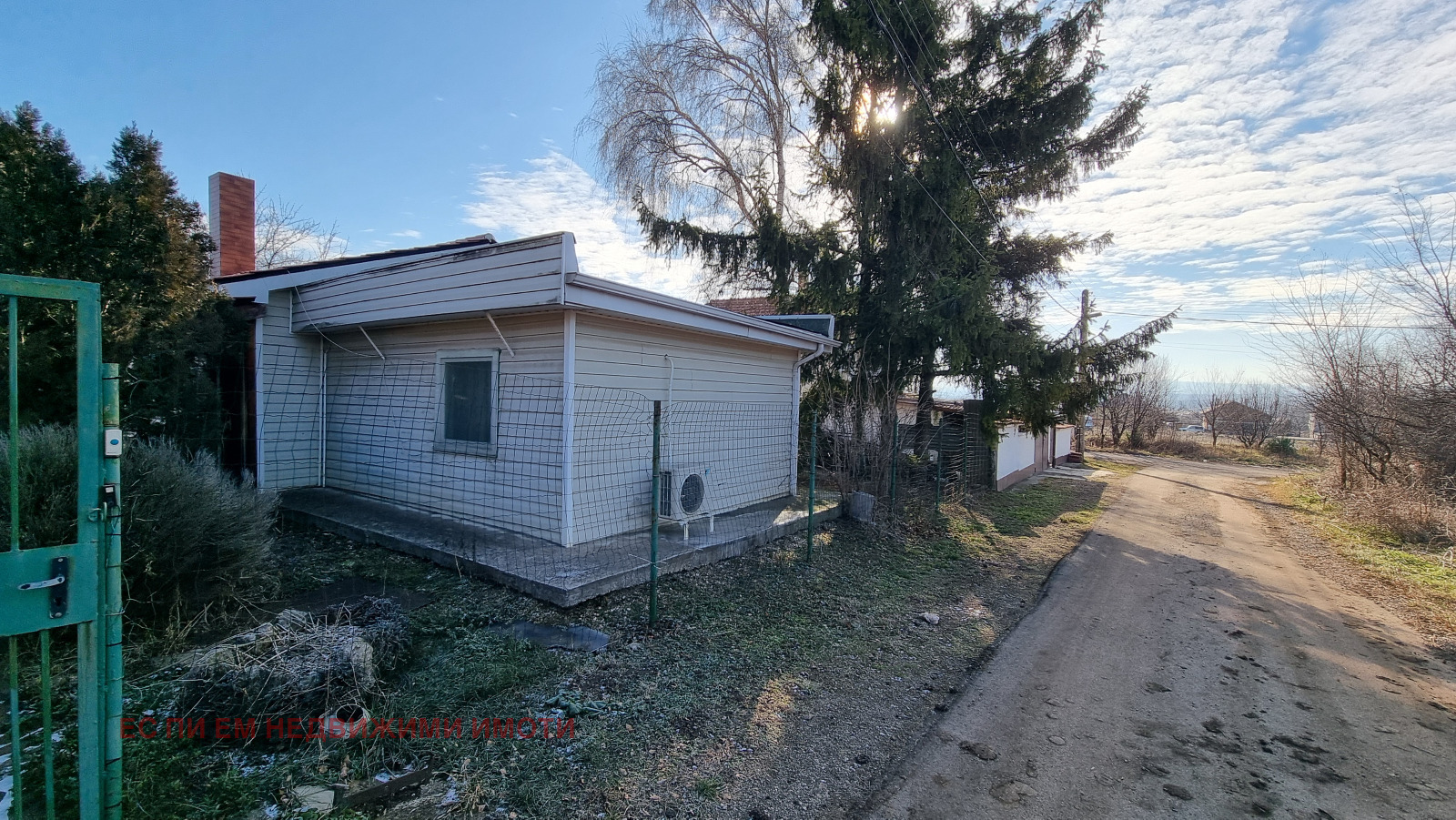 Имотът е ограден с мрежа и метална порта.