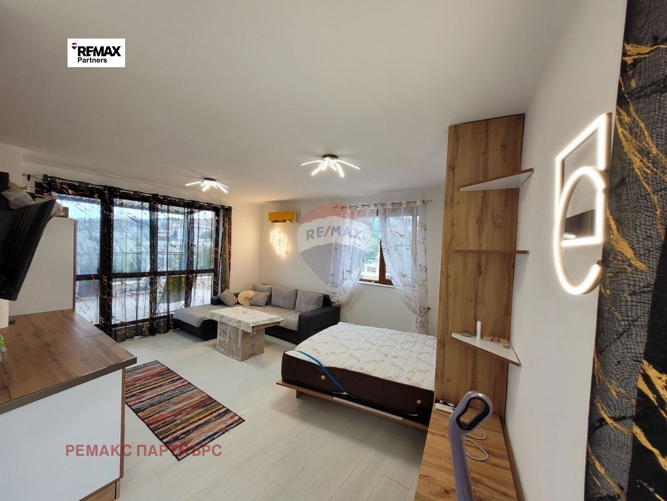 - Просторна дизайнерска всекидневна с интегрирана падаща спалня