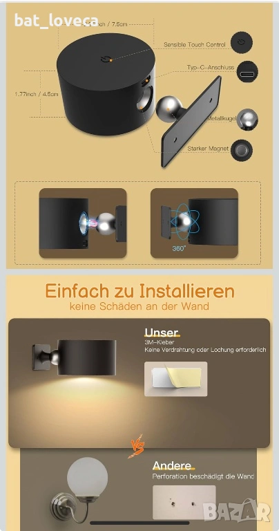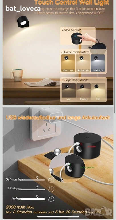 LED стенна лампа акумулаторна, без кабел → Обява 53927717