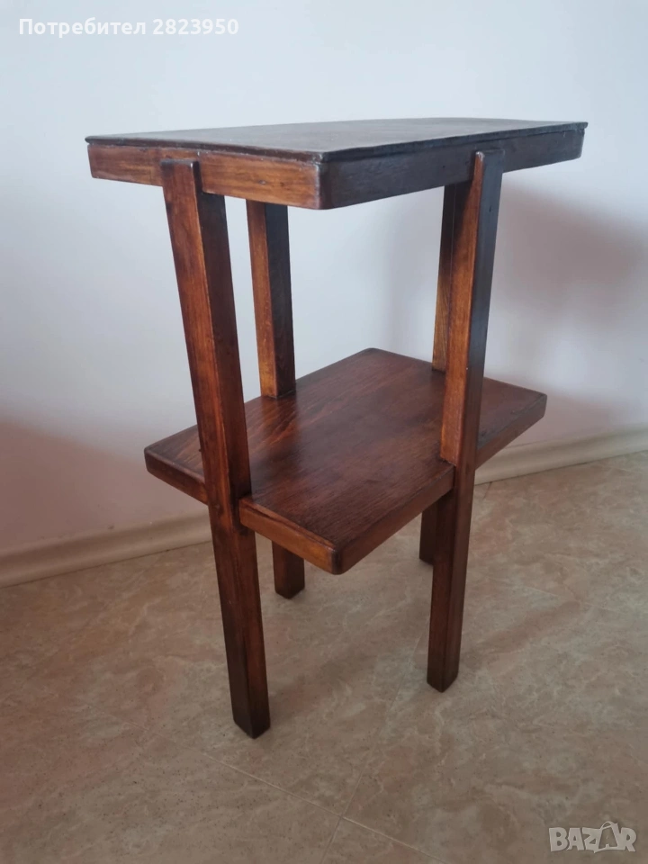 Тази ретро дървена масичка може да служи като помощна масичка, цветарник или нощно шкафче. Тя има две нива за съхранение и е в добро състояние, готова да допълни интериора на всяка стая.