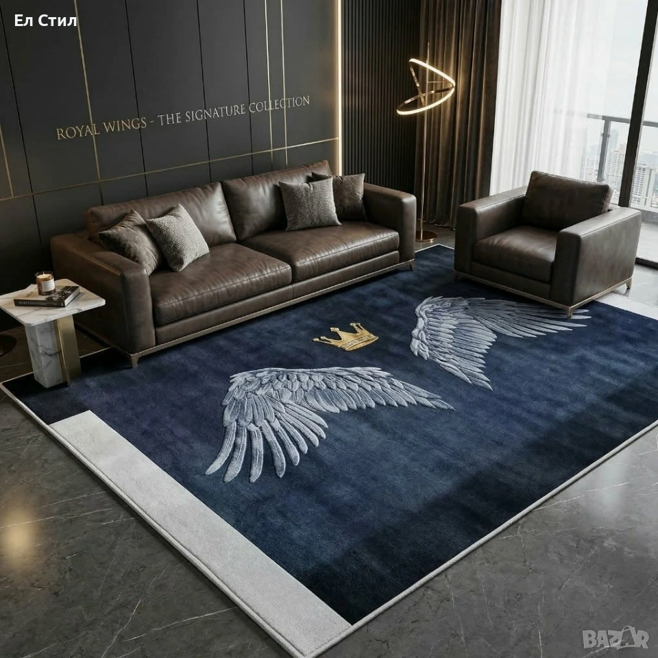 Модерен килим за хол 120х160см - Тъмносин с крила и корона и 3D ефект, Противоплъзгащ