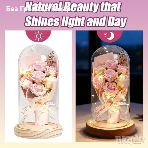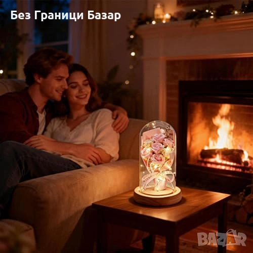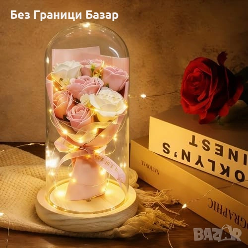 вечна роза в стъклен купол с нежна LED светлина