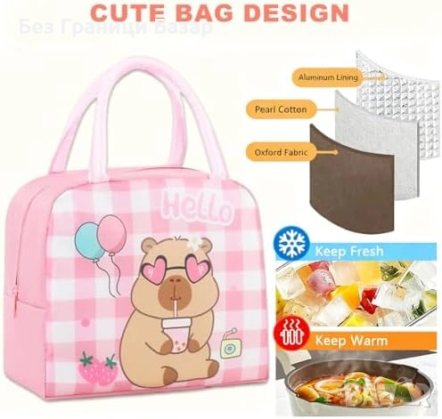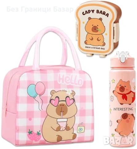 Комплект 3 в 1 с капибара дизайн: термо чанта за храна, бенто кутия и бутилка със сламка