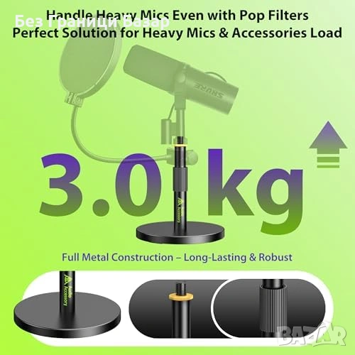Издържа до 3 кг без увисване, дори с поп филтър или дунапрен