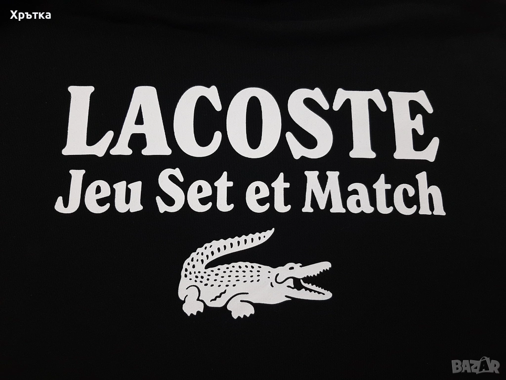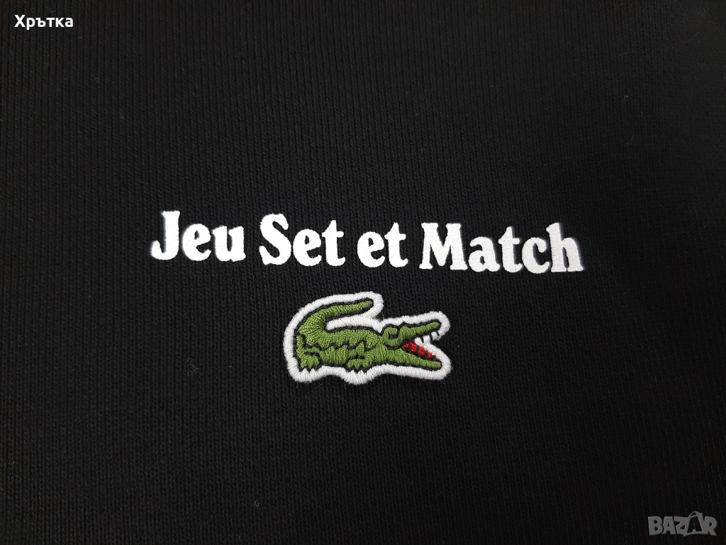 Отпред и отзад има принтиран надпис "Jeu Set et Match" (Гейм, сет и мач), вдъхновен от тениса и историята на марката, както и бродирано крокодилче на гърдите.
