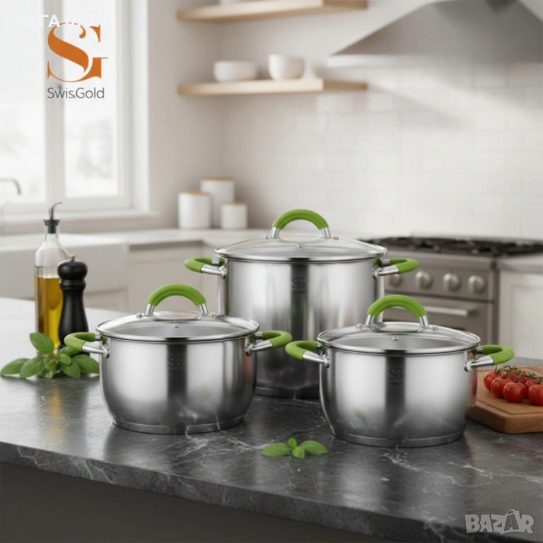 Комплект тенджери Swisgold Alana – 3 броя с капак от неръждаема стомана с 5-слойно капсулно дъно