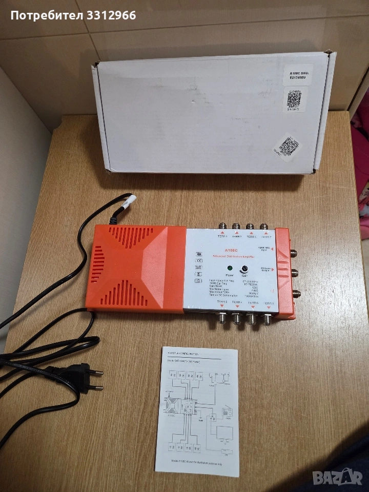 Усилвател за телевизионен сигнал (Advanced Distribution Amplifier) от марката Terra, модел A108C. Функция: Използва се за усилване и разпределяне на ефирни (terrestrial) и сателитни (IRS) сигнали. Честотен обхват: Входният сигнал е в диапазона 87-2350 MHz, докато изходният честотен обхват е 87~782 MHz. Усилване: Устройството осигурява усилване от 12 dB за ефирния сигнал. Характеристики: Разполага с вграден LTE филтър, за да намали смущенията от мобилни мрежи, и максимално ниво на изходния сигнал от 90 dBμV.